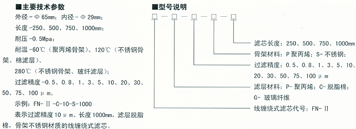 FNIII-5-1000-B表示:过滤精度为5 u m,长度1000mm,端盖为B型的聚丙烯折叠式滤芯。