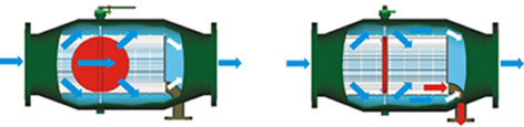 3 正常过滤状态(水流导向阀开启) 图4 反冲排污状态(水流导向阀关闭)