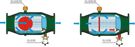 水流导向阀的开启机构分手动和电动两种,手动开启机构小规格时采用手柄开启,大规格(DN500以上)时根据用户需要可采用手动蜗轮开启机构;电动开启机构分定时控制和压差控制两种方式,采用定时控制时,设有微电脑定时时控开关,可按设定时间要求实现自动清洗排污;采用压差控制时,安装有差压控制器,当进出水口的压差达到设定值(一般取为0.04MPa)时, 可实现自动清洗排污。此时排污口安装电动排污阀,水流导向阀和电动排污阀实现联动。